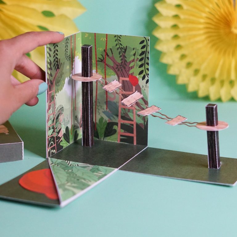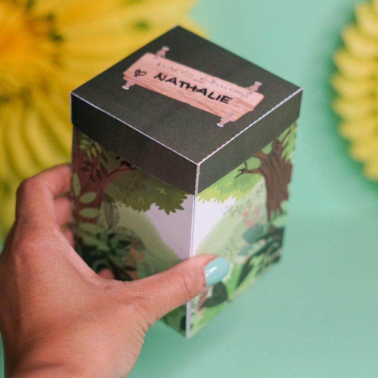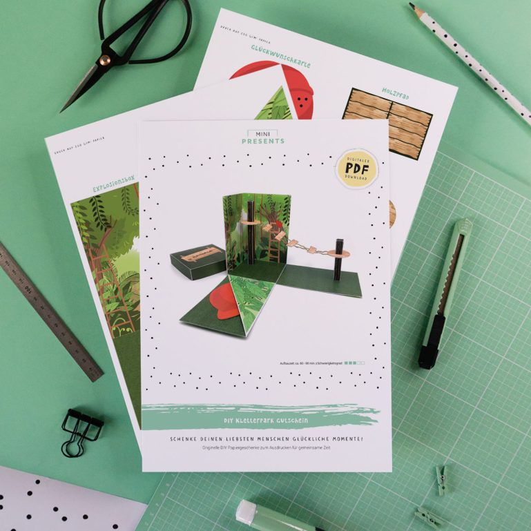 Lass uns einen Kletterpark Gutschein basteln. Mir schwebt ein Hochseilgarten Gutschein zum Basteln vor. Damit es einen Touch von Indianer Jones hat, packen wir unseren Gutschein Kletterpark in eine wilde Dschungellandschaft und stellen eine wackelige Hochseilbrücke auf, die beim Öffnen der Explosionsbox aufklappt und zu schwingen beginnt.