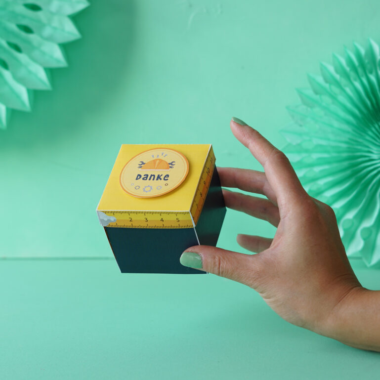 Handwerker erleben oft stressige Tage und bekommen viel Gemecker zu hören. Wenn du dann mit so einer originellen Box um die Ecke kommst, ist der Tag gerettet. In der Mitte ist übrigens perfekt Platz für ein paar Scheine Trinkgeld oder einen Gutschein für den Baumarkt oder den Bäcker um die Ecke. Also, ran an die Schere und sag mal ordentlich Danke!