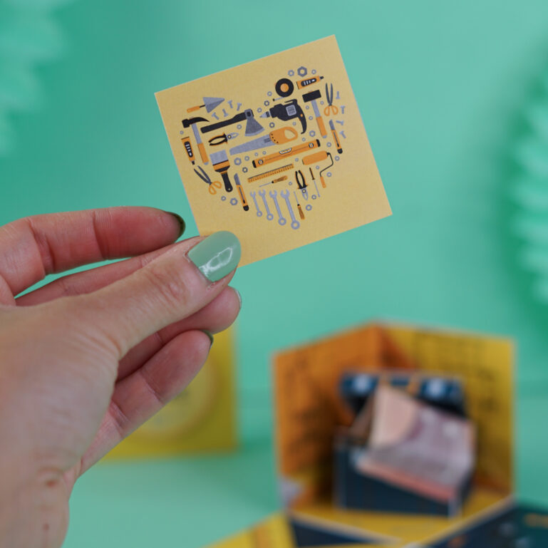 Das klassische Trinkgeld ist natürlich der Favorit! Du kannst die Scheine falten und in dem kleinen Werkzeugkasten platzieren. Auch ein Gutschein für den örtlichen Bäcker oder einen Baumarkt passt super rein. Eine kleine Praline als Nervennahrung schadet natürlich auch nie!